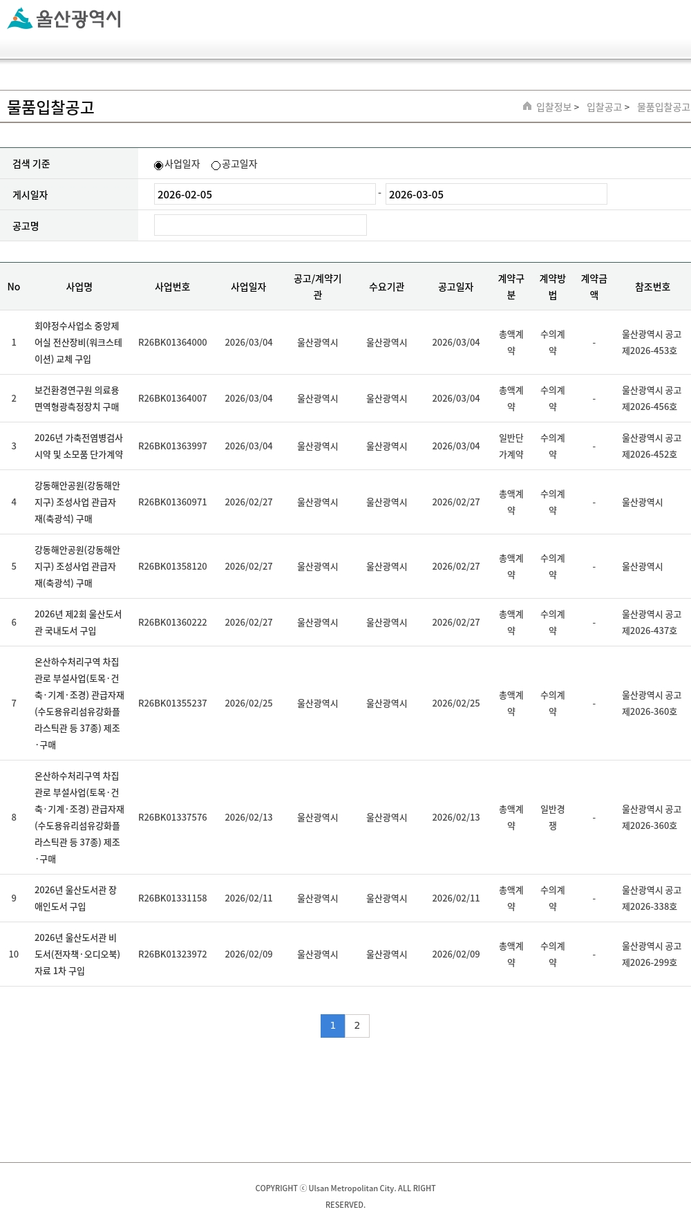 | 5 | 2026년 농업기술센터 연간 청사 및 초화양묘장 유류구입 단가계약 | R26BK01257092 | 2026/01/05 | 울산광역시 | 울산광역시 | 2026/01/05 | 일반단가계약 | 수의계약 | - | 울산광역시 공고 제2026-2호 |