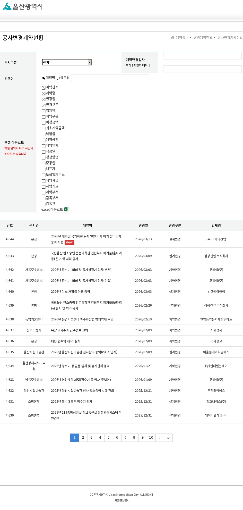 | 4,621 | 울산시립미술관 | 2025년 울산시립미술관 전시관리 용역 시행 건의(e호조 연계) | 2025/12/30 | 계약변경 | 티아이컨설팅 |