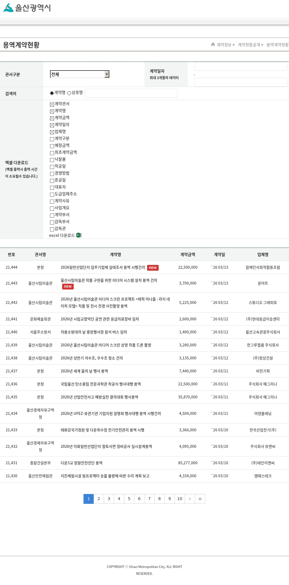 | 21,144 | 울산시립미술관 | 자동변기세정기 렌탈(2층 남자화장실) 새로운글 | 429,600 | `26 01/22 | (주)세스코 |