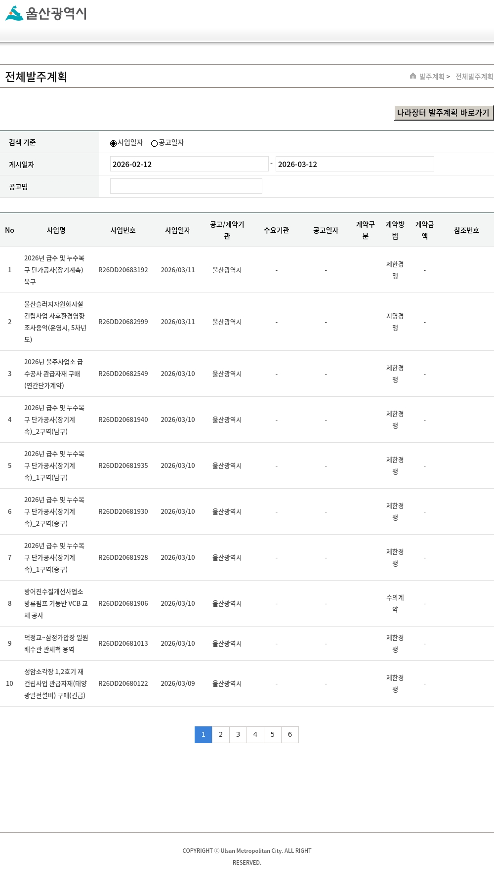 | 1 | 2026년 울산광역시 지구단위계획 재정비 용역 | R26DD20546859 | 2026/01/16 | 울산광역시 | - | - | | 제한경쟁 | - | |